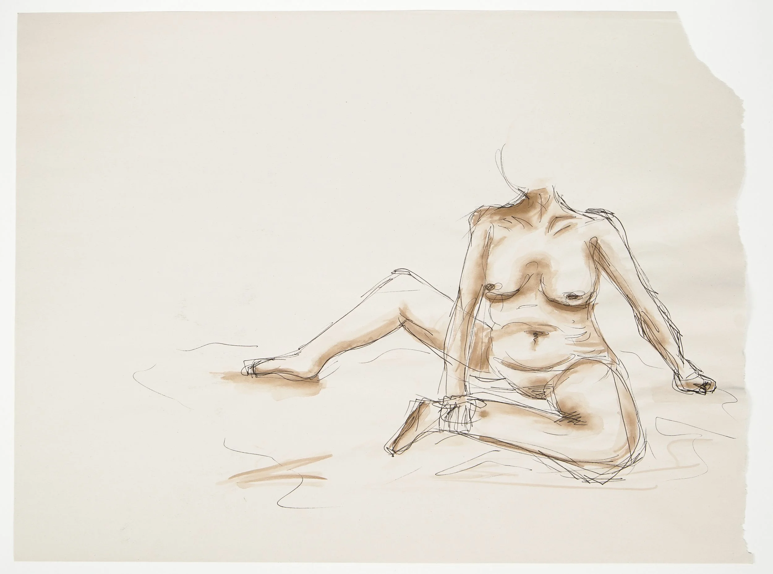 Drawn from life, but I left the head out on purpose. I wanted it to be more about the posture than the person. The loose lines and ink wash show how stillness can feel alive. This figure drawing captures a woman whose body is balanced, peaceful, and grounded.